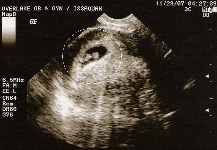 You can see the miniature lima-bean of a baby inside the black tear drop. I circled it just in case you’re wondering. 🙂 Jim voted on this picture (we have four) because you can most clearly see the head (top right) and the bottom of the body (lower left).