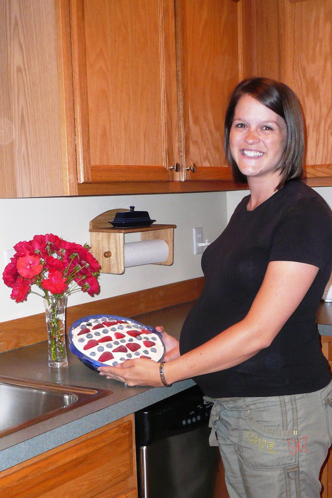 I had a marvelous Independence Day. My parents came for dinner and we went to the lake to watch the big fireworks show. Here is a picture of me, my 38-week belly, flowers from my mom’s rose bushes, and “Becky’s Fourth of July Ice Cream Pie.” Until next week…