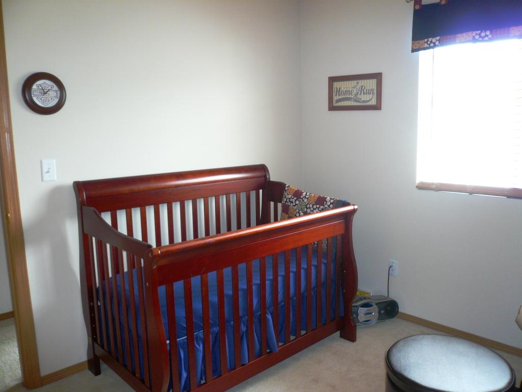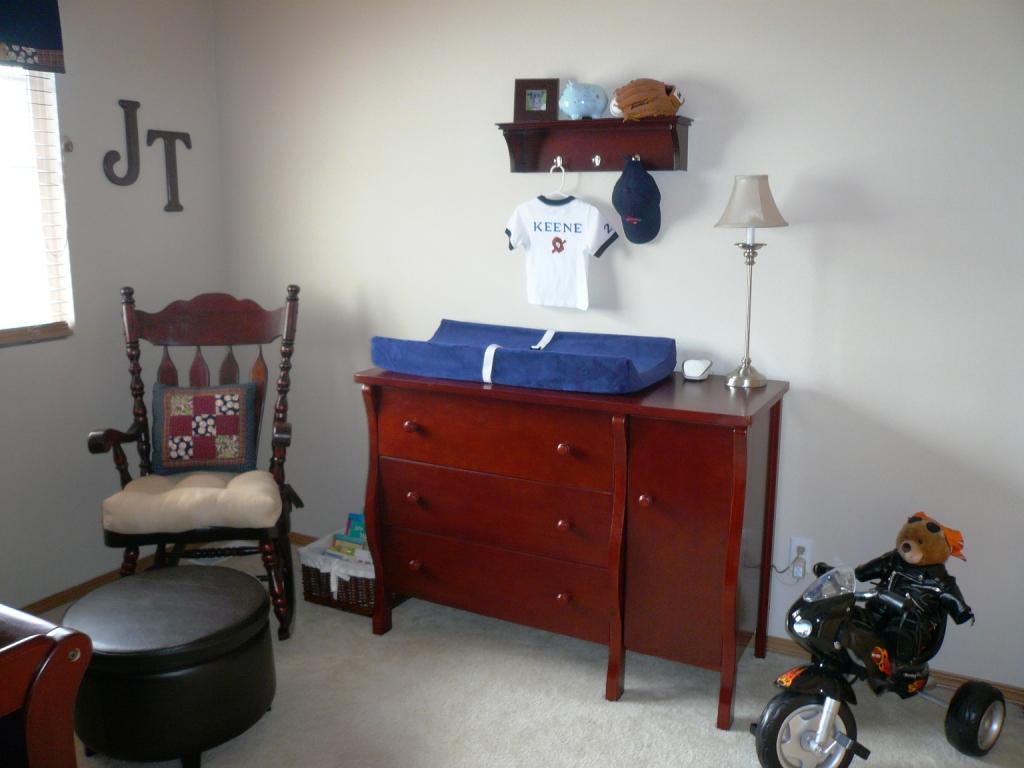 JT’s room is all done – pictures below. I’m including a picture of the closet too because I think it’s pretty ridiculous how many pairs of shoes he has already… and how much they’re worth. Keep in mind I have only bought one pair, and they were $3.99 on clearance. He has Vans, Nike, Puma, Keen, two pairs of GAP dress shoes, baby Birkenstocks, and more. What you can’t see in the pictures is a basket of board books next to the rocking chair and a basket of toys next to the crib. (If you don’t already know that clicking on the picture gets you a bigger version… now is a good time to learn!)