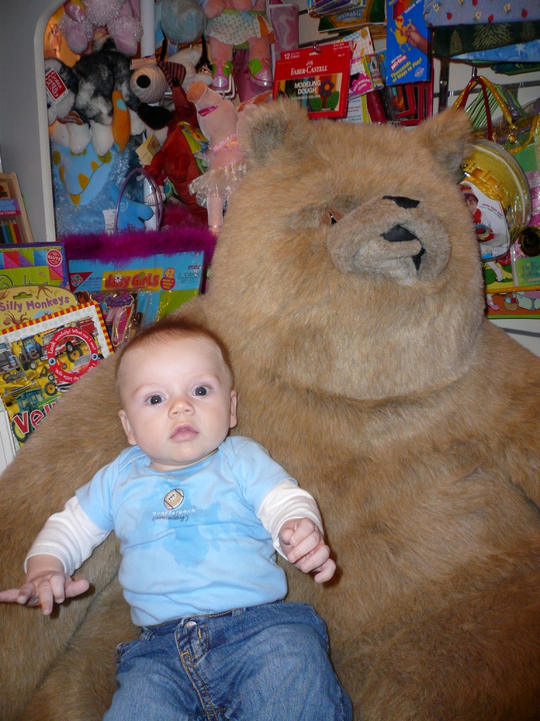 JT sitting on the big cuddly chair bear in the kids’ shop in the Crossroads Mall.