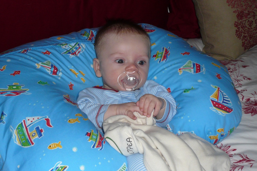He is starting to enjoy “naked time” in his crib, and loves to play with a blanket. Jim wanted to see if his Harley do-rag fits now, and that’s how this little picture came about.
