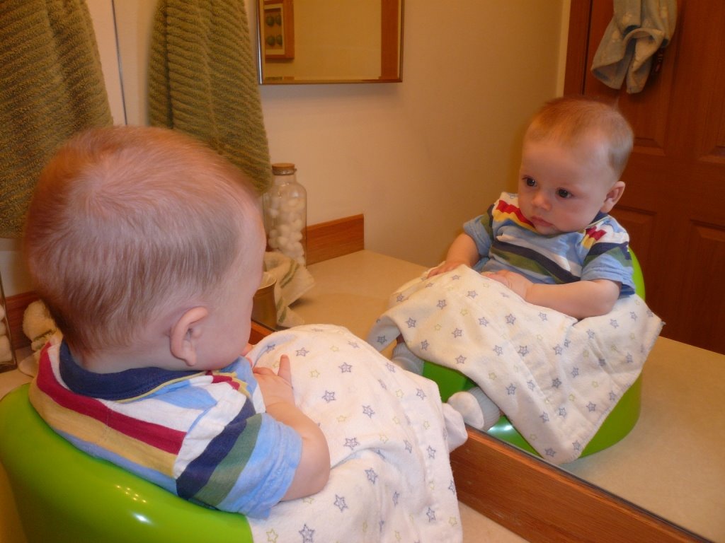 JT loves to look in the mirror. He’s been spending time sitting in his BebePod checking out his reflection. Apparently it can take a long time until a child discovers that he is looking at himself. Meanwhile, it’s great entertainment.