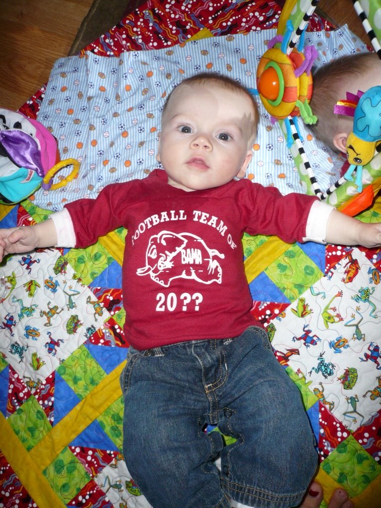 Grandma Keene found a shirt in a box of Jim’s old clothes that was perfect for JT to wear this Saturday for watching football. He looks so handsome in crimson! We think it’s a little odd that Jim had a shirt that has “team of 20??” when he was little, since he would have been 21 in the year 2000 and almost done with college. Anyway, I still can’t believe JT slept right through the yelling in our house when the game went into overtime today.
