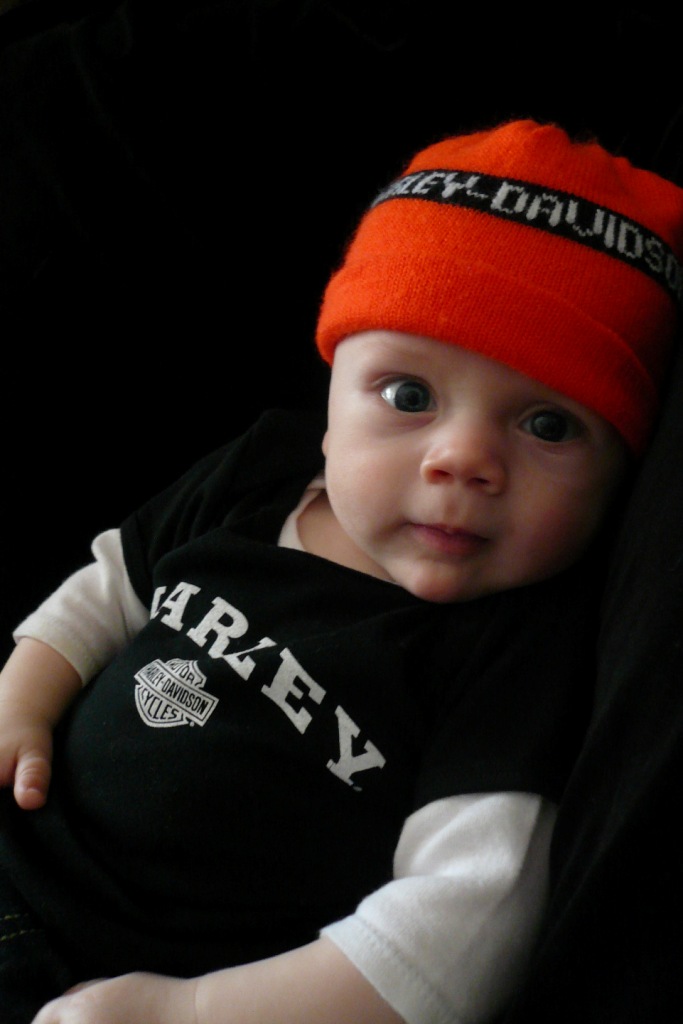 JT turned four months old this week. He is starting to blow raspberries, and once laughed so hard that he snorted. He can grab toys, burp cloths, and other things with his hands and put them in his mouth. His 4-month check up at the pediatrician’s office is on Monday, so we’ll have a height and weight update then. I took a couple of pictures on Saturday, partly because he was so handsome in his Harley attire, and partly to mark his age.