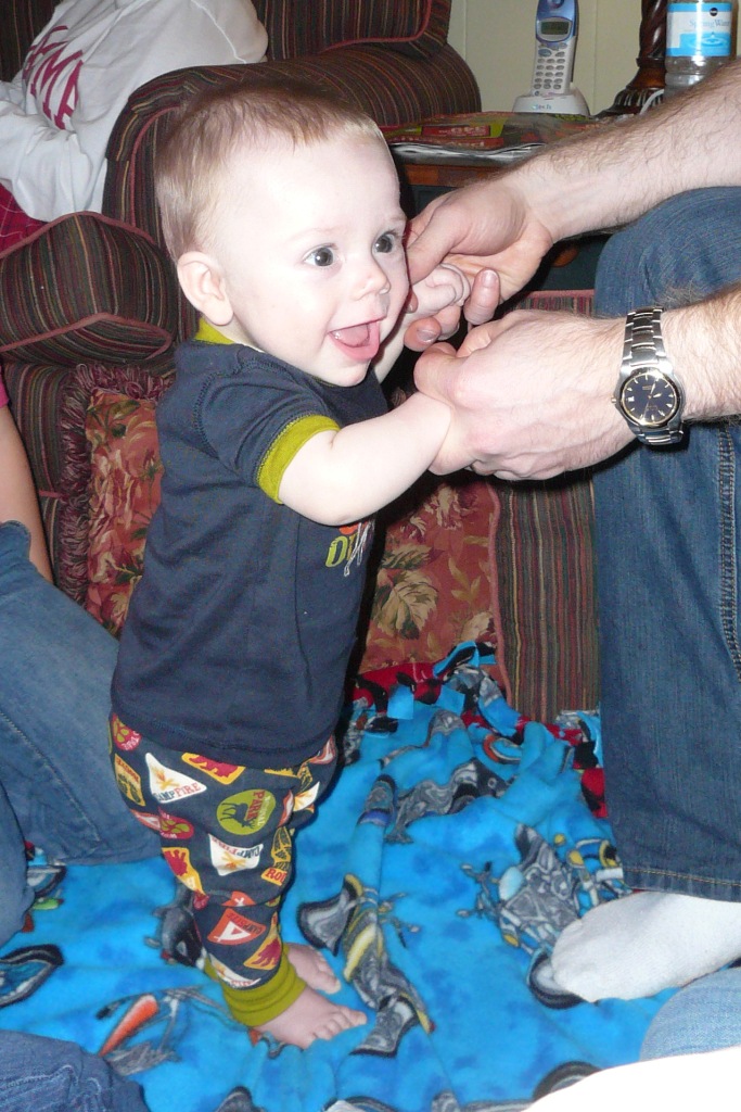 Jim has been working on JT’s “Hit it!” for next summer’s water skiing. If you don’t think a one year old can ski, check this out. Meanwhile, JT pushes all by himself to standing and is working on his balance! 🙂 He finally got into swim lessons (can you believe there’s a waiting list?) and should start soon.