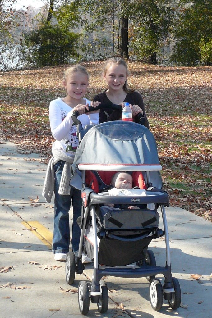Earlier that day, we went for a walk on the River Walk in Tuscaloosa. The weather was lovely. JT fell asleep in the stroller while my two nieces took turns pushing. (Side note: Jim and I took my nephew and nieces to see “Madagascar 2” while they were visiting… it is one of the funniest movies I’ve seen in a while!)