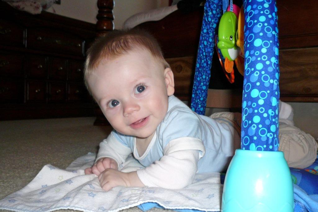 This week JT turned 5 months old. At his immunization appointment, he weighed 15 lbs 4 oz and was 27 inches long. He is working on sitting up by himself. It is tough work, but he manages to stay up for a moment or two before toppling over. The good news is that he doesn’t seem to mind toppling over and then we try it again. He is also working on moving around more on his tummy.