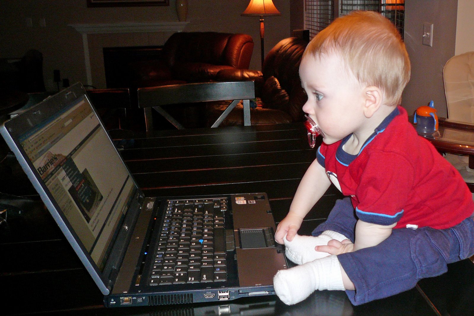 He has also started grabbing for everything that is within arms’ reach. This new skill requires more attention to detail on my part, in which I’m failing miserably. Today he grabbed my half peanut butter sandwich off the plate and had the whole side of it in his mouth before I could stop him. This is partly because I tend to carry him on one side and several other things in the other… I think that has to stop. He will pull the tablecloth at the dinner table, grab for your coffee mug, and pull small things like hooded sweatshirt drawstrings. Like all babies, he loves cell phones, remote controls, and laptops. Oooooh, cool buttons!