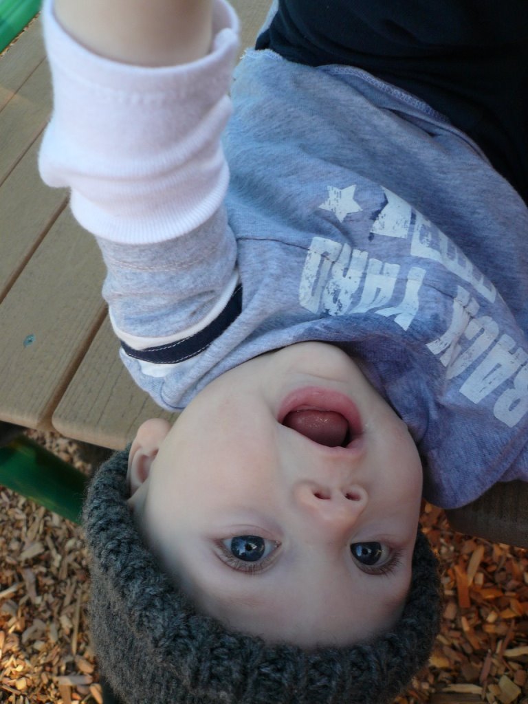 Dangling off the side of the play structure (that’s right, my child is several feet in the air upside down…)