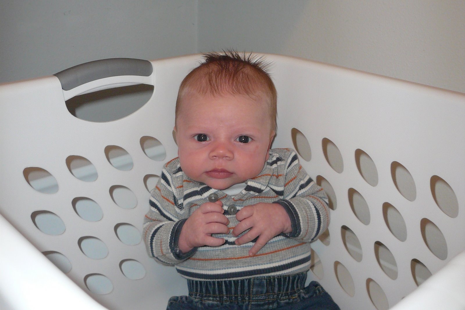 JT still loves his laundry basket rides. Here he is (left) now, and (right) only three weeks old. Wow, what a change in such a short time!