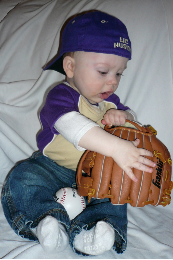 Here’s our little man ready to play ball. Onesie courtesy Kim Pham… hat courtesy Eli Hollander, who was sad to give it away. π