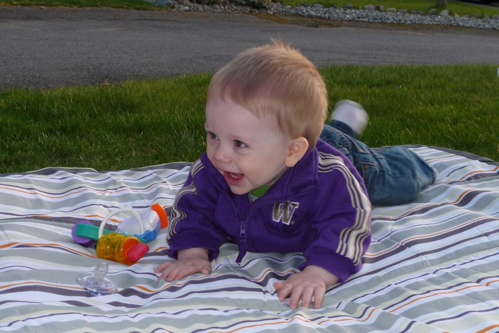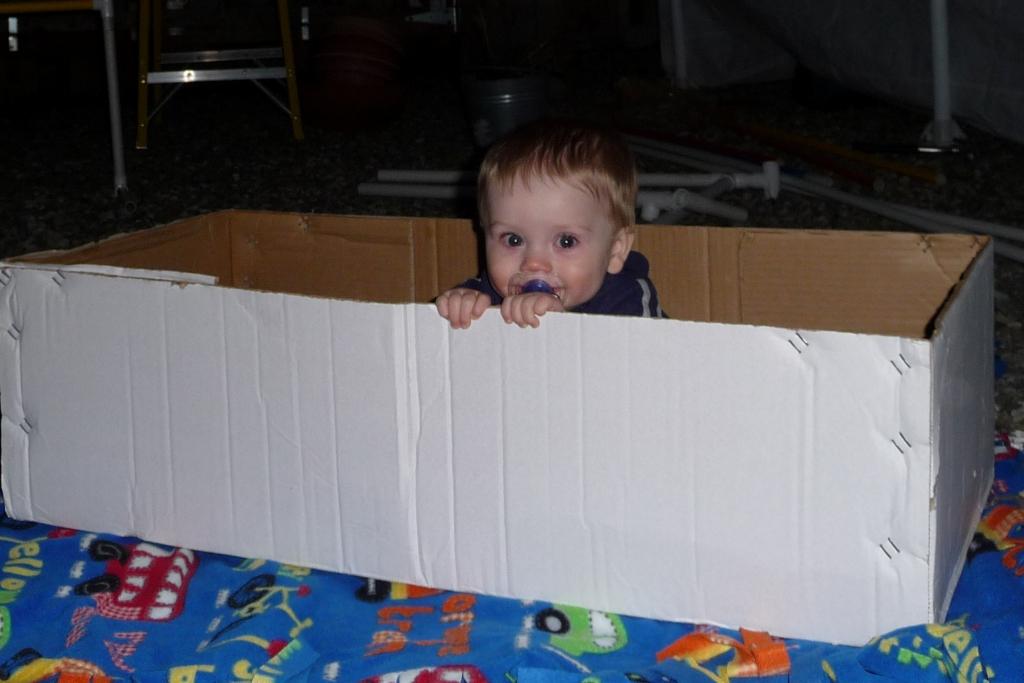 When Jim and I were outside working this week, we had him on a blanket. As time wore on and we were tired of putting him back on the blanket (instead of letting him scoot over the edge and grab handfuls of rocks), we finally put him in a big box with a couple of his toys. JT thought that was pretty funny, and then everyone was happy.