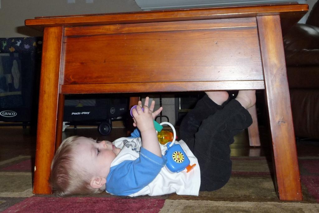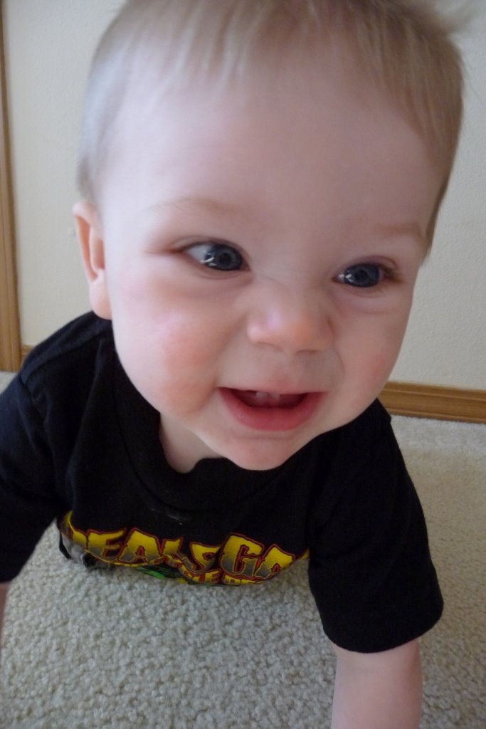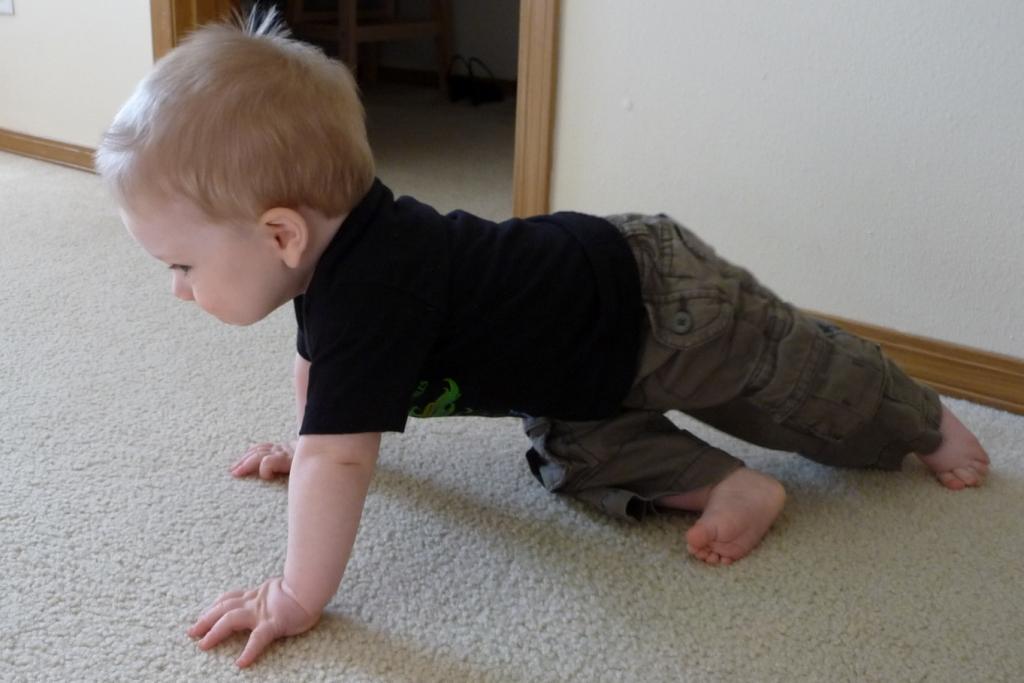JT is so close to crawling that it’s getting quite funny. He crawls backward, actually, just not forward. But he moves from place to place with relative ease, and gets his hands on anything that he finds once he gets there. He even does a little yoga-ish movement like this: