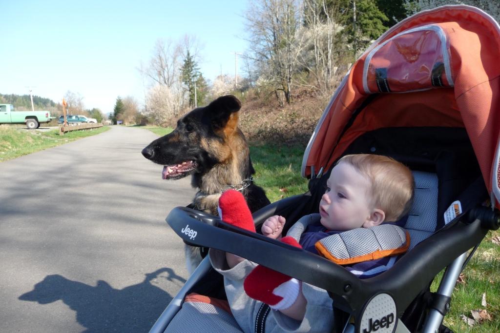 Yep, JT has now been alive outside as long as he was alive inside. This week we had some great weather. JT and Slider went with me on a run on a trail near our house. What do you think grabbed both of their attentions?