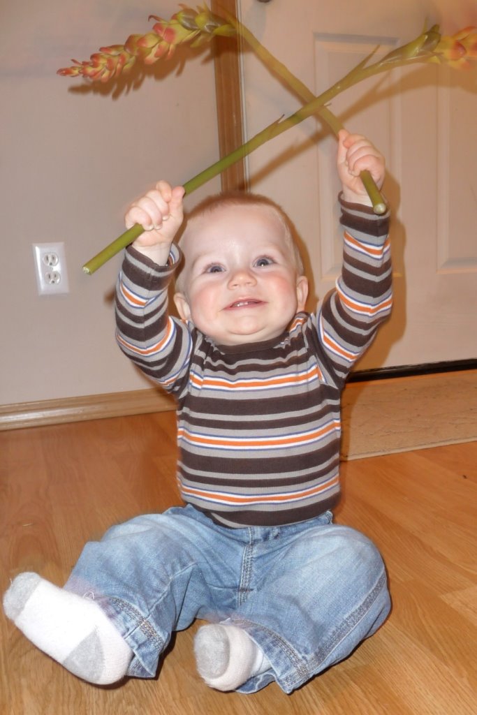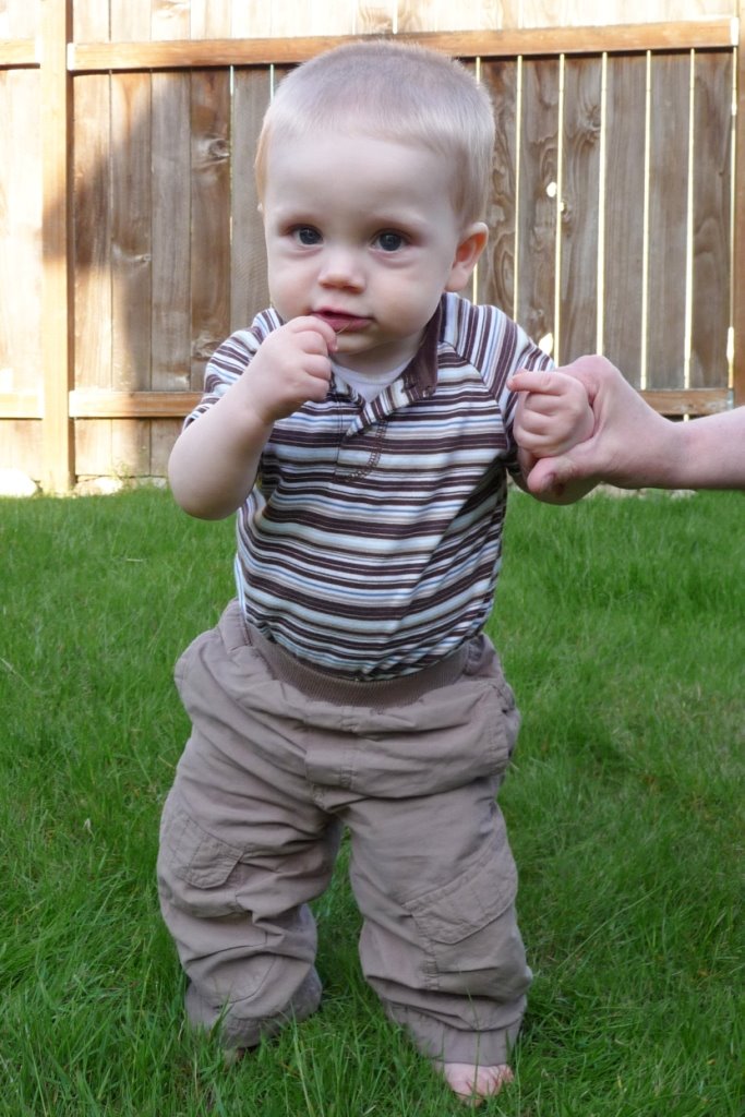That’s right, we’re into double digits. We decided to take some pictures in the backyard to commemorate the occasion. That’s Grandma Cole’s hand helping JT keep his balance. He loves to stand up (and loves to push himself up to standing) but is still a little wobbly!