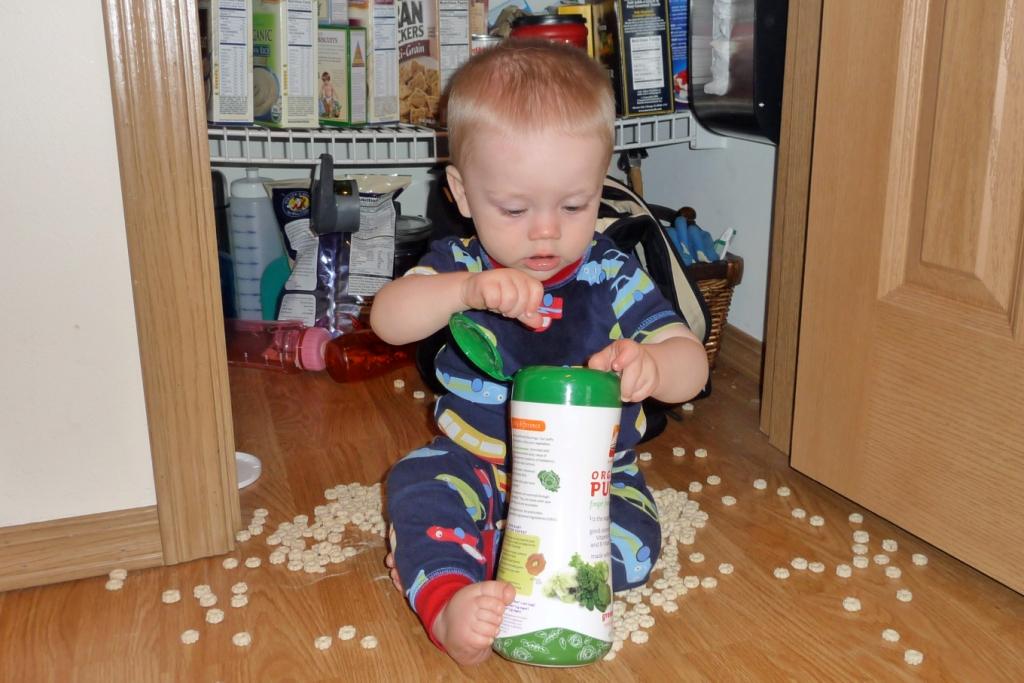 We don’t mind letting JT explore around the house, as long as what he’s doing isn’t going to get him hurt. So when he opens the pantry door and takes things out, I think, no big deal. Then he figured out how to open the puffs container, and *swish* – puffs all over the floor. He hasn’t gotten banned from the pantry, but he had to help clean up the puffs. π