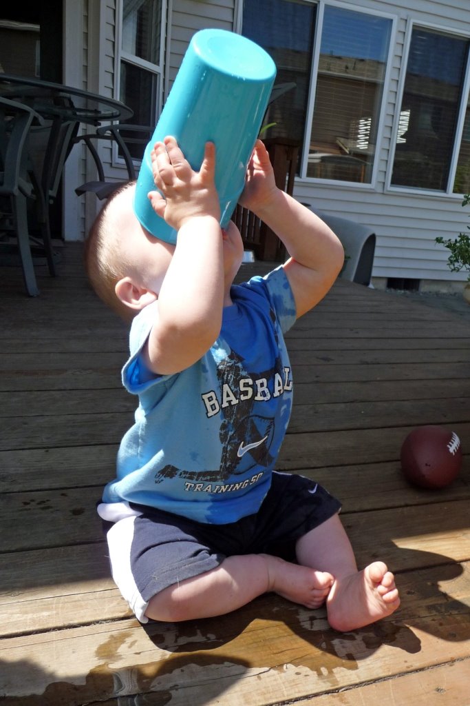 All of the sudden, JT figured out how to tip his sippy cup back to get every last drop. He has applied this new knowledge to cup drinking as well. As you can see, this means every last drop is all over him and his surroundings. Too cute!
