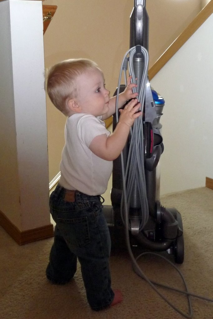 JT is standing all over the place now. He loves the vacuum cleaner. Jim told him today that he probably won’t love it when we start making him use it… but for now, he can’t wait to touch it.