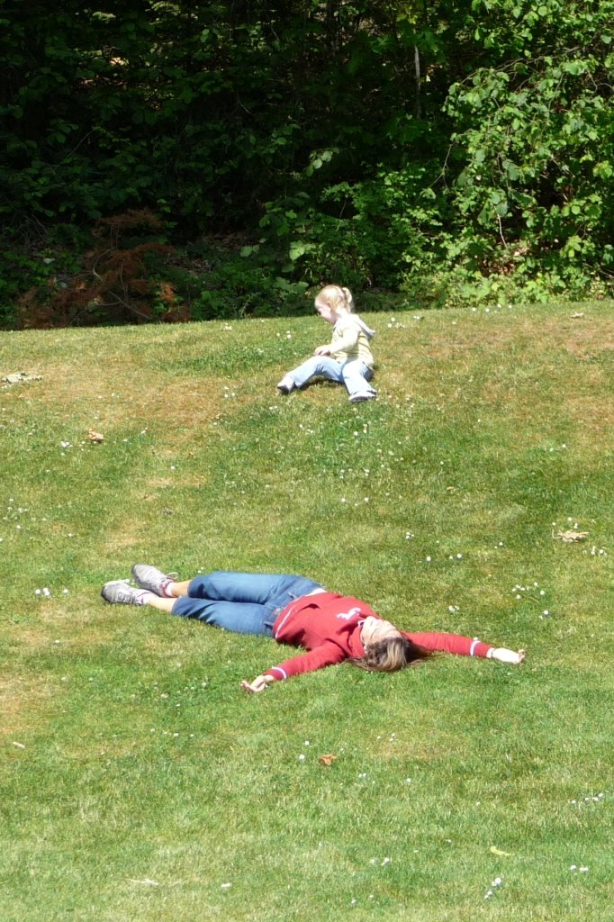 While headed back to the car, Jim suggested that we could play Roly-Poly down the hill. Of course, Aly loved this idea. Then Jim told Aly that “Becky just loves to play Roly-Poly!” and so I was stuck. Once she got the hang of it, she thought it was pretty fun. JT watched from his stroller.