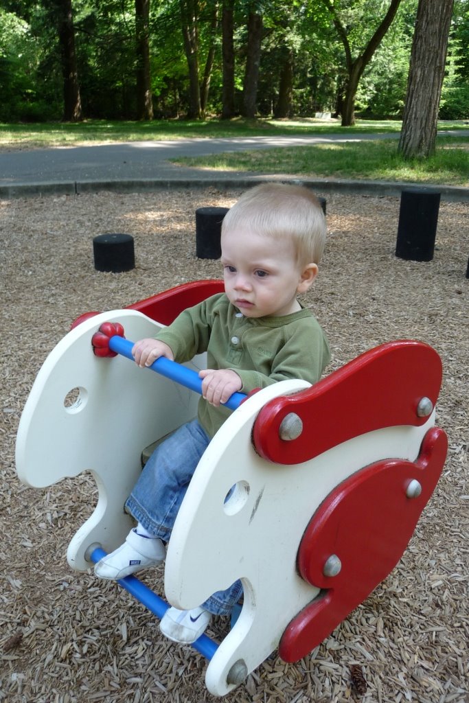 Next we moved on to the play structures. Aly and JT got to try out the slides. Aly, of course, went on the much cooler slides while JT was stuck sitting on this rabbit. I think he’s thinking, “What am I supposed to do on this stupid rabbit?”