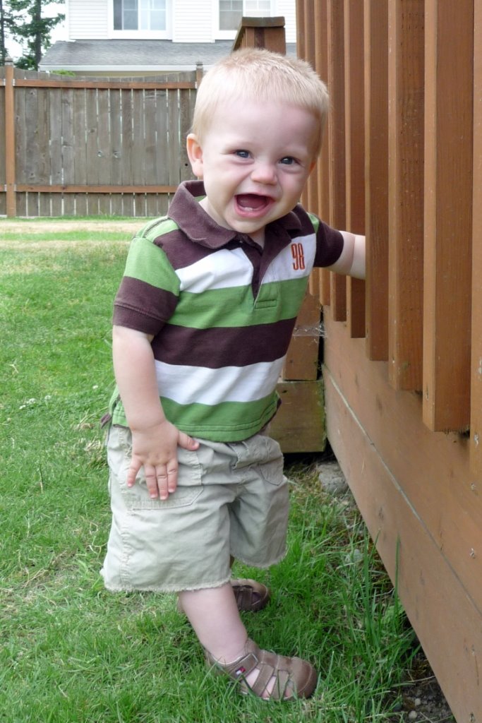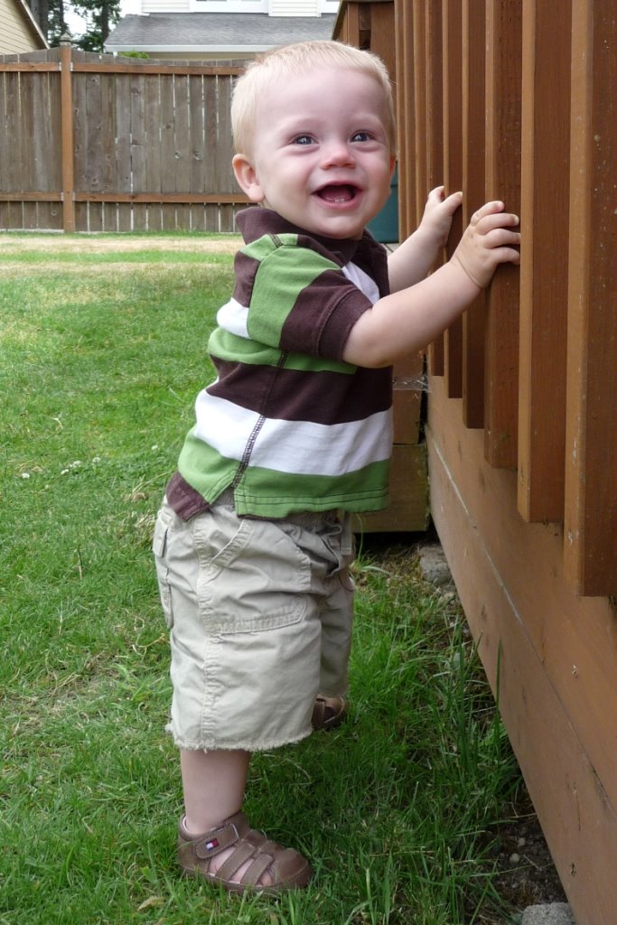 Meanwhile, we’ve been doing some pretty fun stuff while we wait. Here are three of JT’s 11-month-old pictures that I took in our backyard. Special thanks to Jim for being so funny right behind me while I snapped away. The first one is my new favorite picture of him. And yes, he’s holding on to the deck rail all by himself.