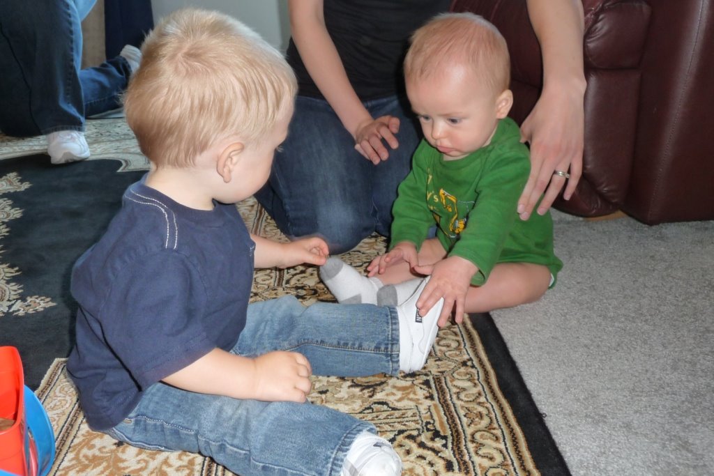 JT also got to meet his second cousin Gideon for the first time. Gideon is about five months old. He had a great time kicking JT, who thought it was sooooo funny. Gideon is practicing sitting up by himself, so JT was very helpful and handed him a toy or two while they were playing. We did have to remind him about the tackling rule, however.