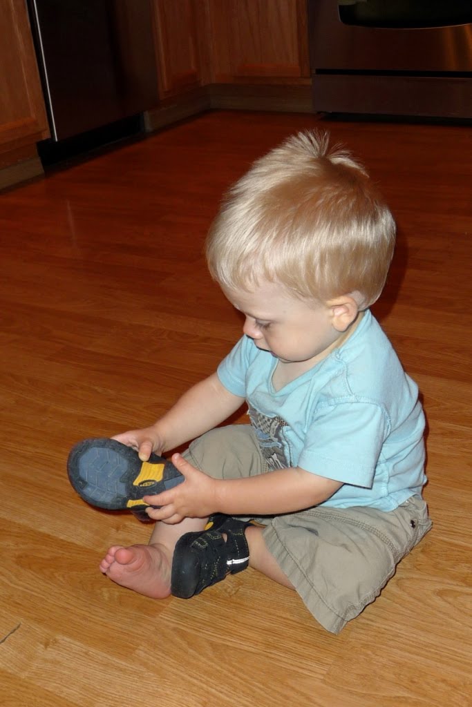 Have you heard the nursery rhyme, “One shoe off and one shoe on, Deedle deedle dumpling, my son John”? It’s true at our house. All the time. Here JT has lost a shoe and stopped to get it back on. He successful getting the Velcro undone but just couldn’t get it back on his foot.