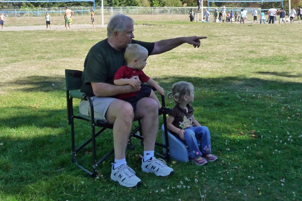 JT, Grandpa Keene, and Isabelle watch the Bocce Ball tournament