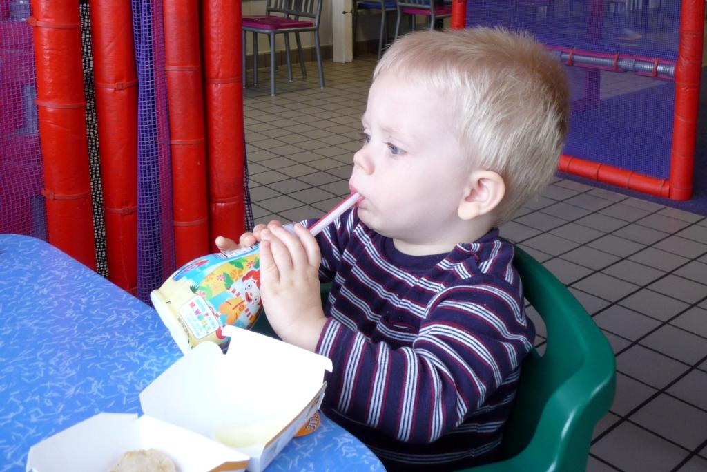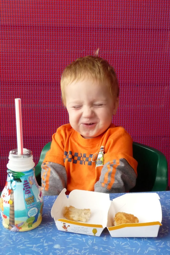 To wrap up the morning, and since we were all very hungry, I treated the boys to McDonalds happy meals. I love the new healthier options… I peeled the breading off the nuggets and got apple slices and milk on the side. Good stuff. JT eats his nuggets like Mom does… one big bite!