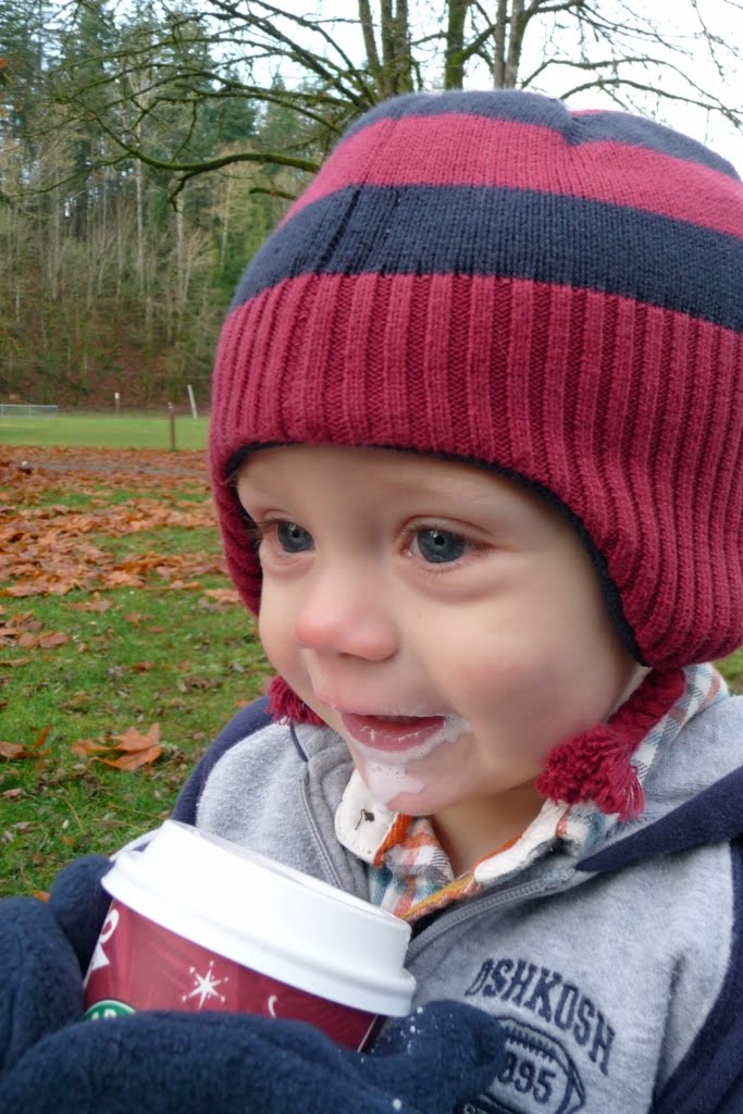 Our trip to the park this morning included a trip to Starbucks, where I got an eggnog latte (tall, decaf, nonfat) and JT got a whole milk steamer. Yummmmmm.