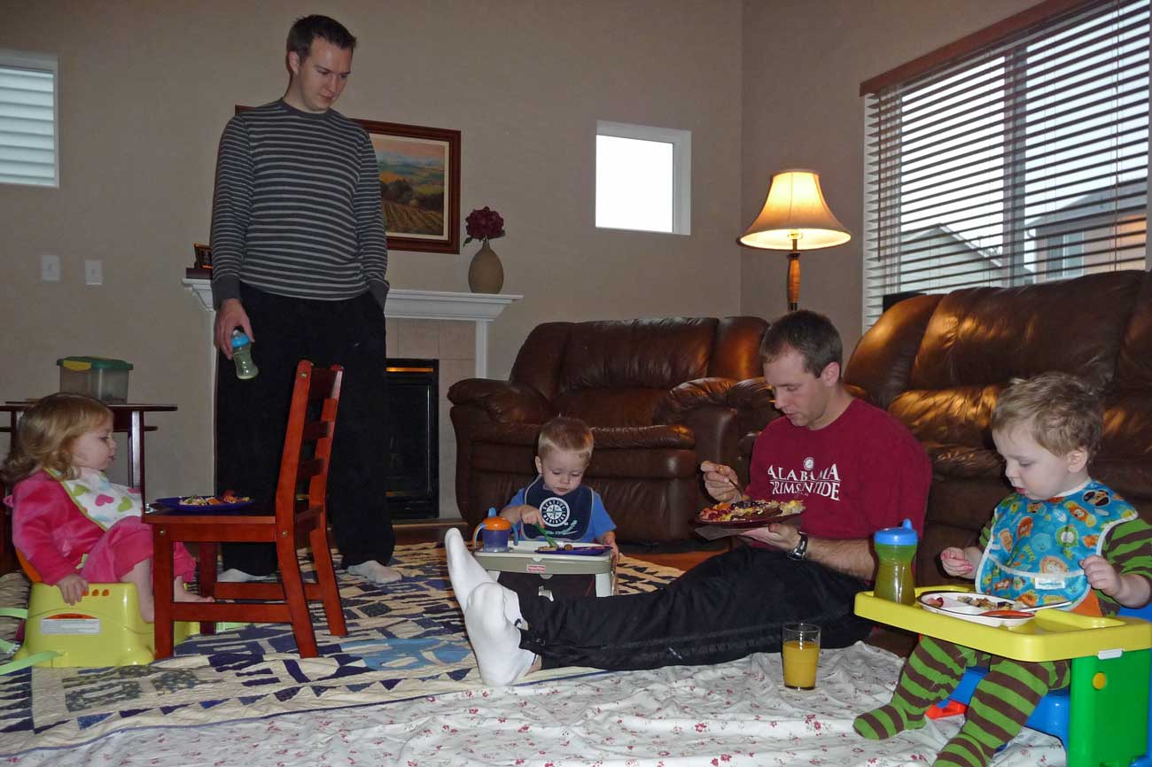 We celebrated New Year’s Eve by snuggling in at home and watching a movie. Very calm and relaxing. Then we celebrated New Year’s Day the same way we always do: hosting the Skagens, the Joneses, and the Shucks for brunch. And every year there are more children! Just two years ago, there was only one. This year, there were seven. Not so calm, but still super fun… and yes, even a little relaxing, since the dress code is pajamas, and the company is great. 🙂