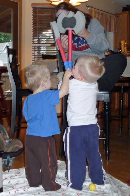 We broke out the foam swords and axes (always a hit), and the kids tore around the house with them. Here JT and Cole are attaching Sarah…
