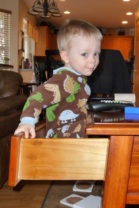 Recently, he figured out how to crawl into the drawer in the coffee table. Cute!
