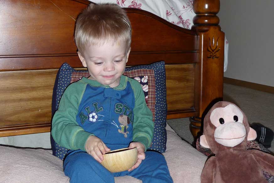 JT is also getting really attached to three things: George, blanket, binky. Right around 7:30 (and after nap), he runs and gets those three things… just to have them close by. So the other night we had snuggle time in our bedroom, and I got down my body pillow. He ran and got his comfort devices, and we had a snack and milk on the floor.