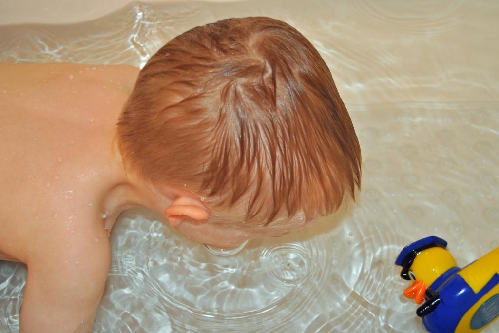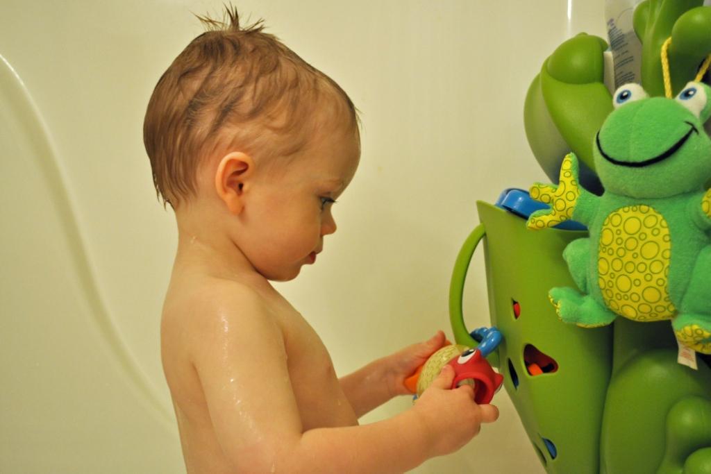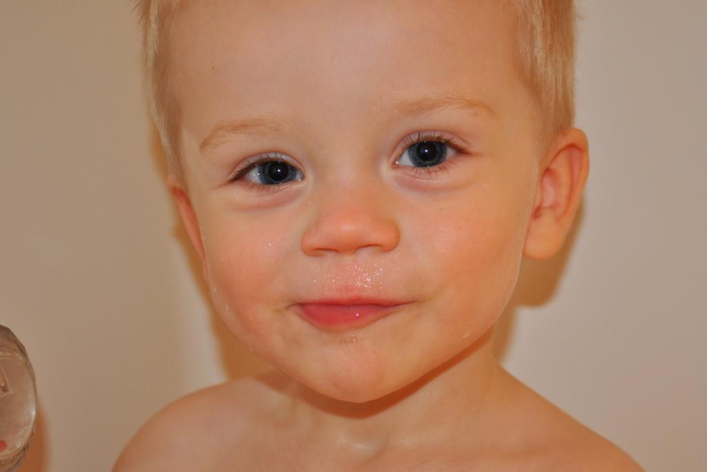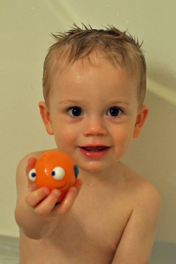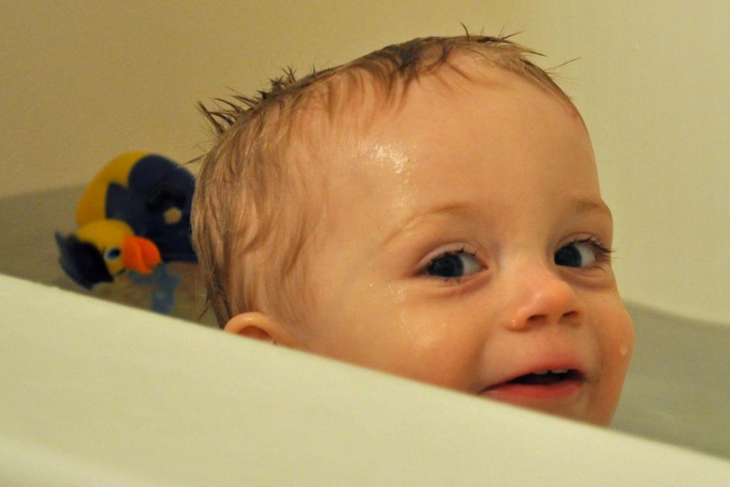 He always has tons of fun in the bath. Here’s his “I’m thinking about splashing you” face.