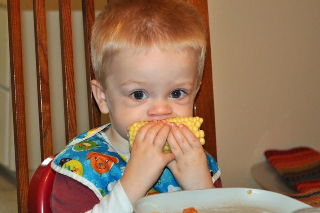 JT tried corn on the cob for the first time and loved it. After a couple of up close demo bites from Mom, he was off. He ate his whole cob and had to be reminded that he was only trying to eat kernels, not the cob itself. No more sawing it off the cob for us… yum!