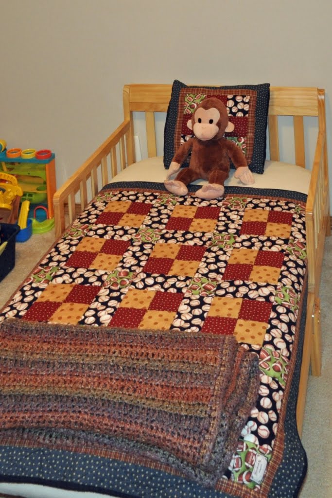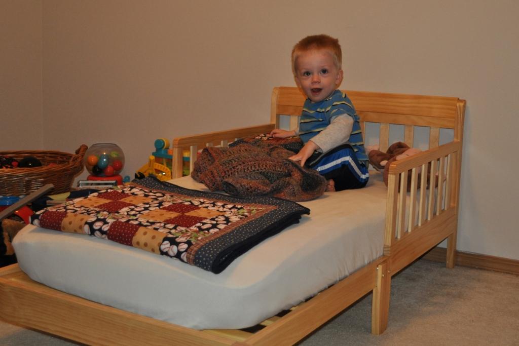 JT napped in his pack-n-play while we were gone, and then Jim had his new bed ready for bedtime. He even got a new sports sheet to match his quilt, which was an exciting find.