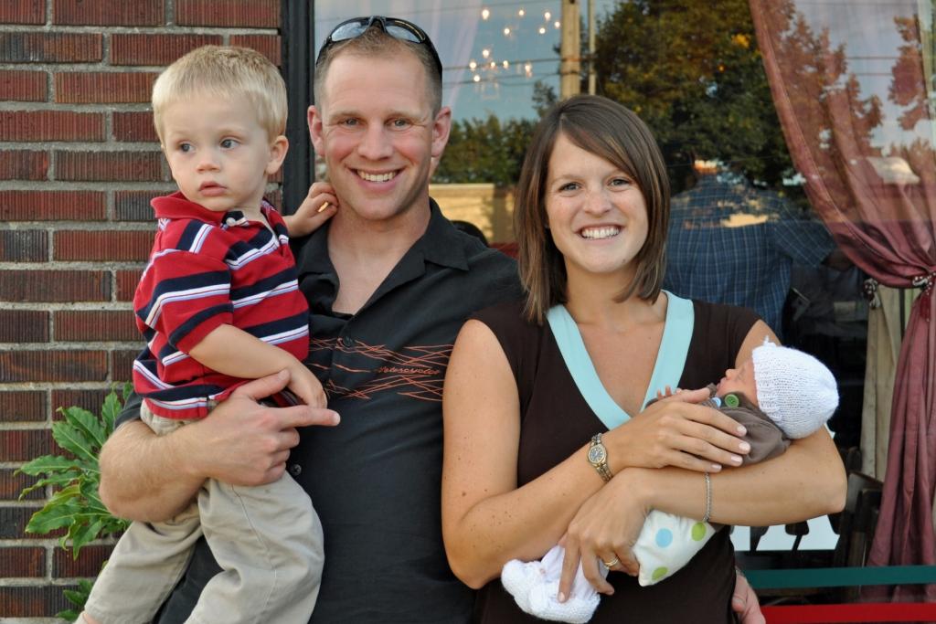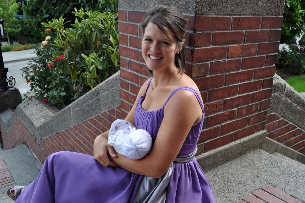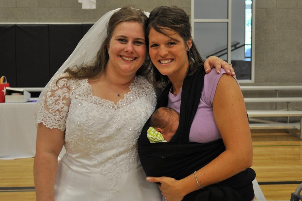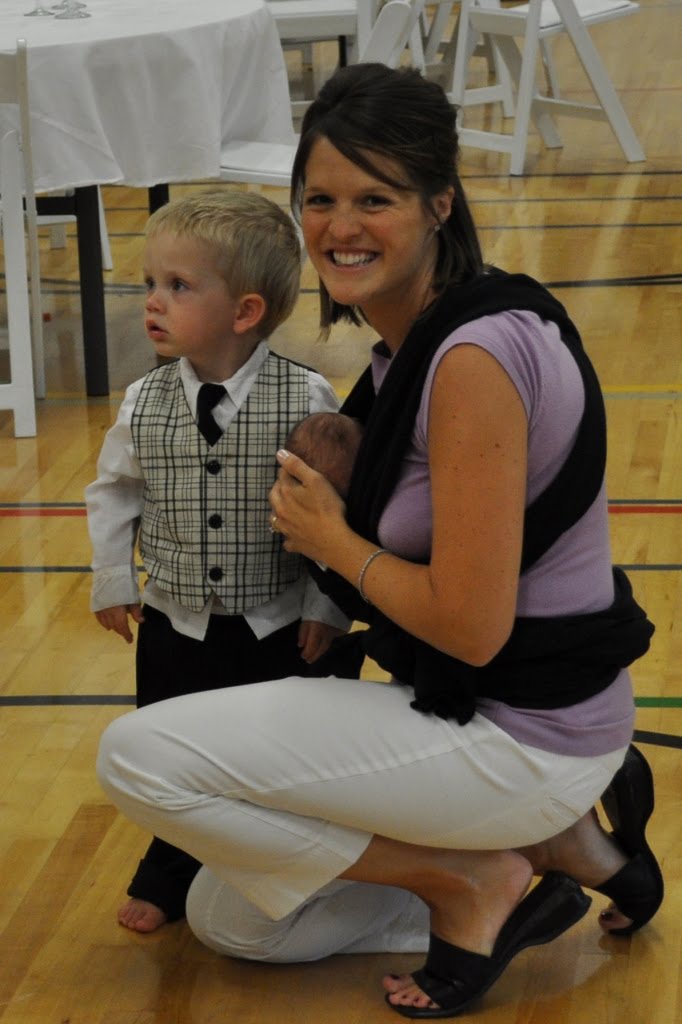 I pulled the “I just had a c-section one week ago” card and changed out of my bridesmaid dress into something that worked better to carry Haley in the Moby Wrap, and Jim took care of JT.