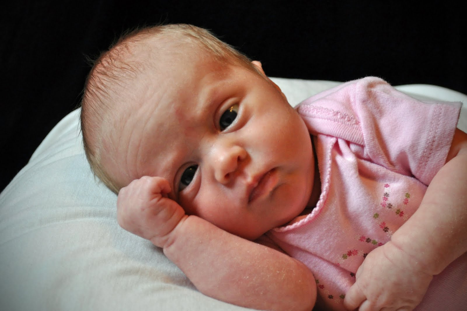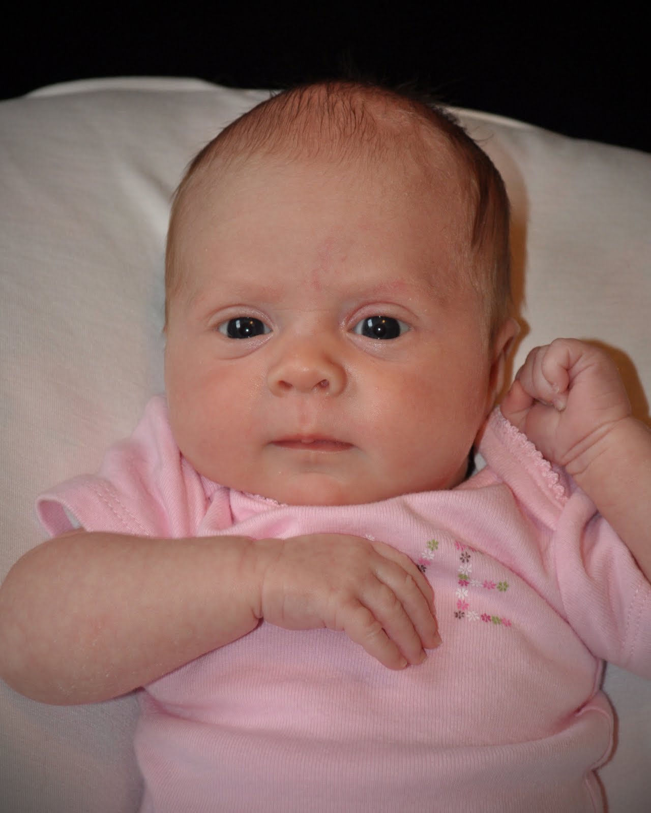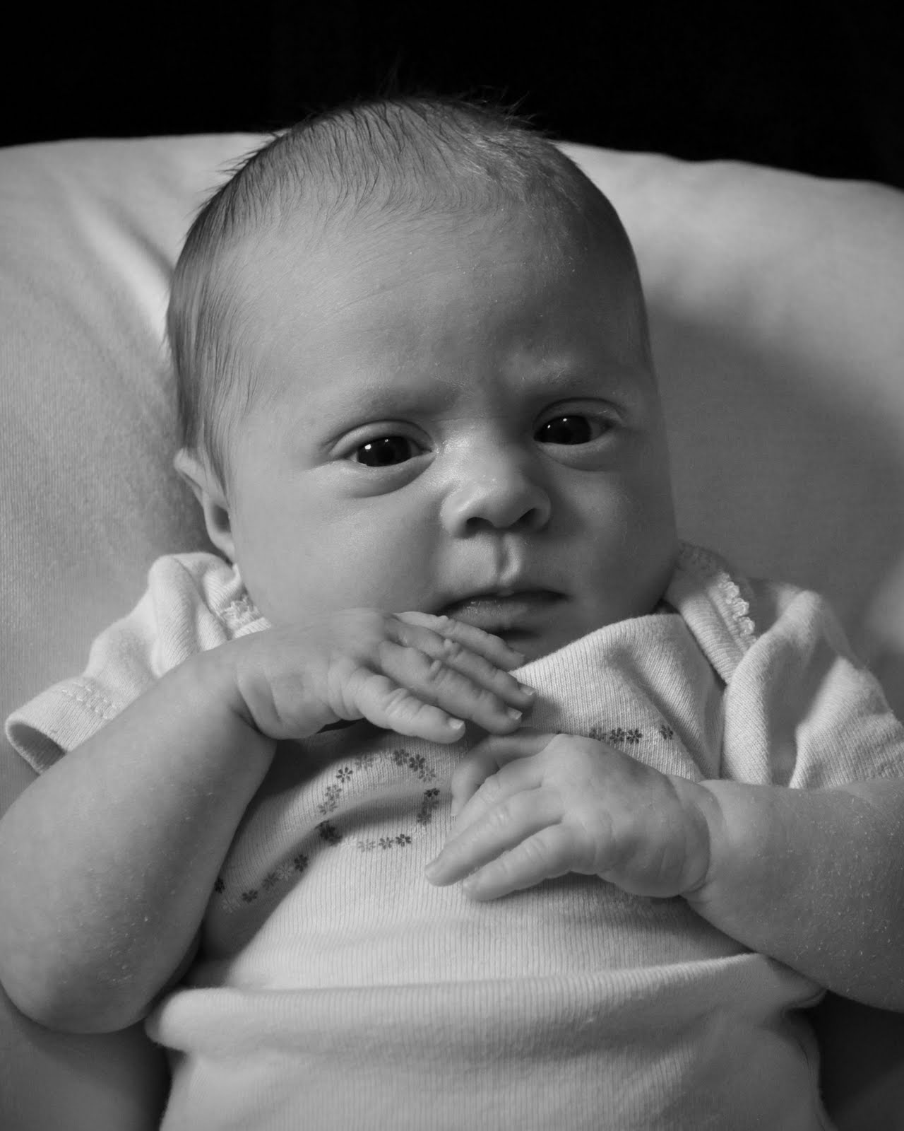 We can’t believe our baby girl is already one month old. Her due date was yesterday! She is growing a lot. We can tell because suddenly the newborn clothes fit, and she feels heavier. I’m curious how much she weighs! Here are her one-month pictures…