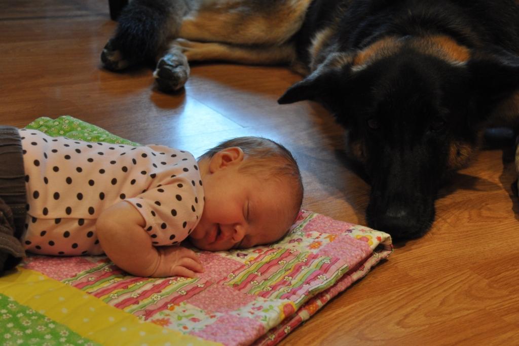 …well protected by Slider. People have asked if Slider is good with our kids since JT was born, especially because she is pretty excitable and dominant and loud. The good news is that she seems to understand her place in our home, and she is a female German Sheperd, so she likes her little pack to be safe. She is not allowed on the blanket but remains close at hand just in case. We didn’t have to remind her of that rule when Haley came along… her memory is apparently in working order.