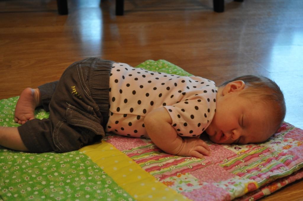 Haley only gets tummy time on the floor while JT is at nap or eating, because who knows what she would get run over with while he’s playing. Even though he’s careful and very good at steering his Harley bike around the house, it’s not worth the risk. So here she is enjoying some tummy time during lunch…
