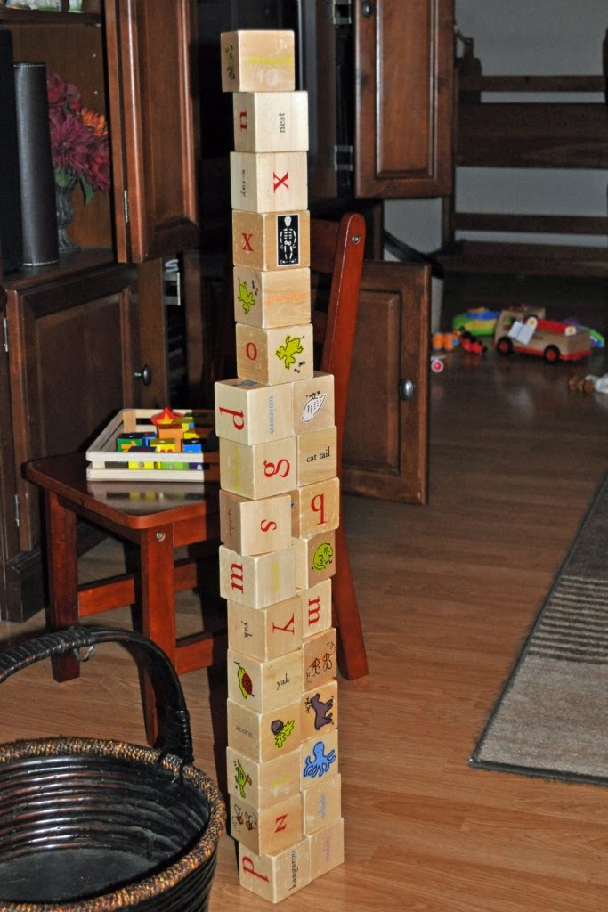 Tonight JT started building towers while I was making dinner. When I turned around, he had built one so high it was taller than him! I wanted to get him in the picture but he got shy and wouldn’t stand next to it.