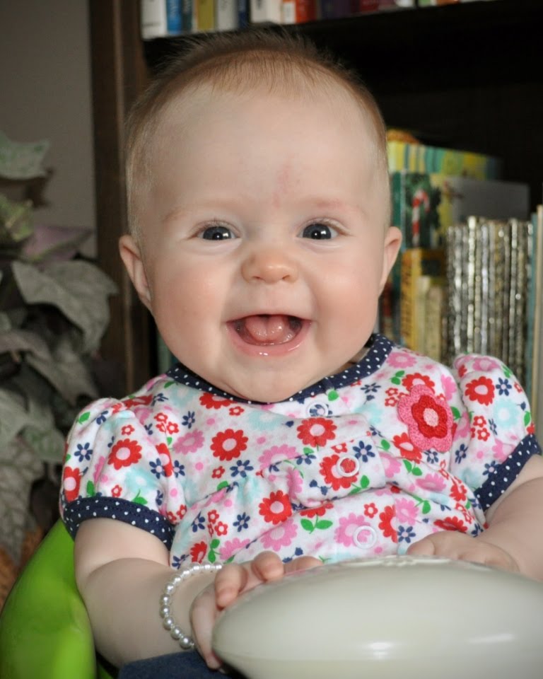 She also starting eating rice cereal just a day before she hit the five month mark. I am not super excited to venture into solids, but I’d like her to be eating well by six months and I’d like her to go to bed just a little earlier than she does now. We were impressed that she knew what to do right away, but she wasn’t impressed that it was a slow process. Apparently her patience does have an end.