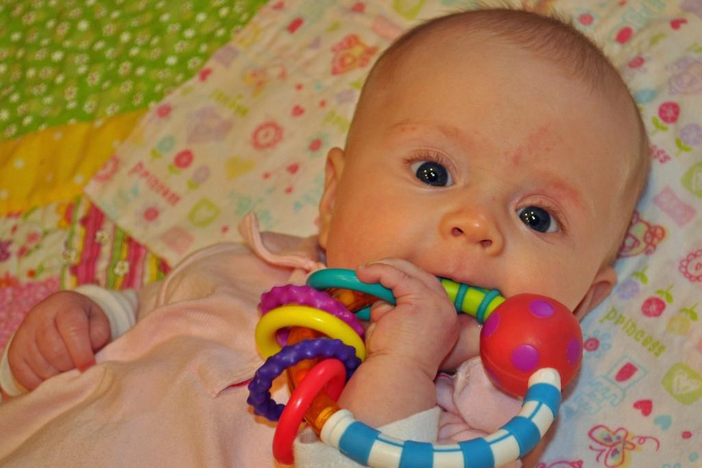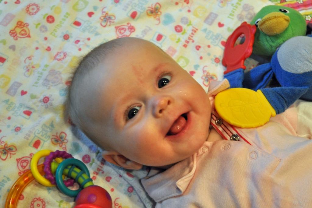 She has mastered getting large objects into her mouth and spends most of her time doing just that. Her binky is still a little elusive and, although she can take it out and look at it, she has trouble getting it back in exactly right. It is actually pretty funny to watch.