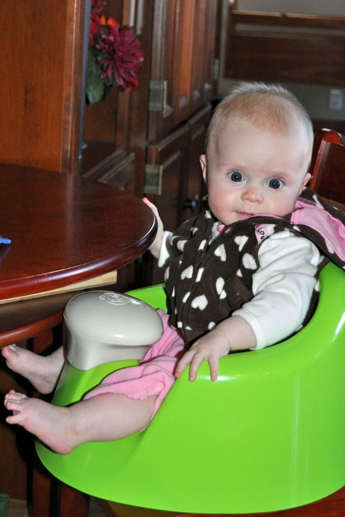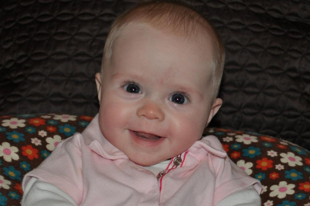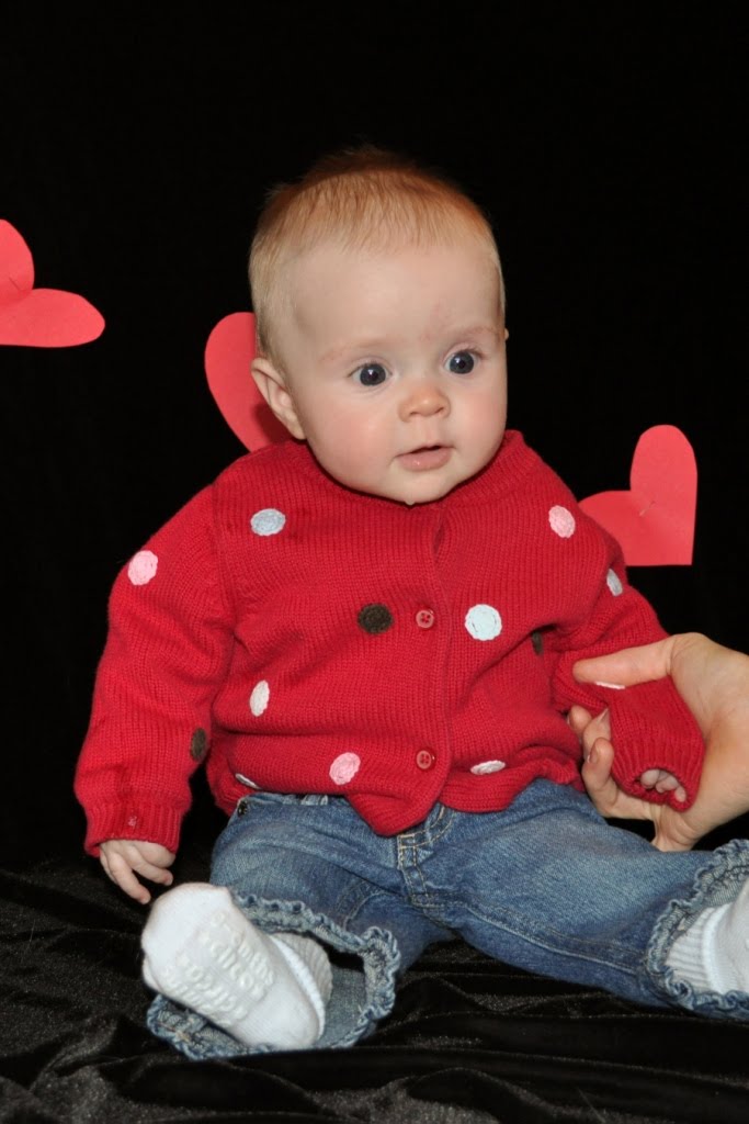 Well, well, look who’s trying to sit by herself. π Haley is starting to manage a one- or two-second tripod sit on her own before she topples over! This is an early Valentine’s Day picture.