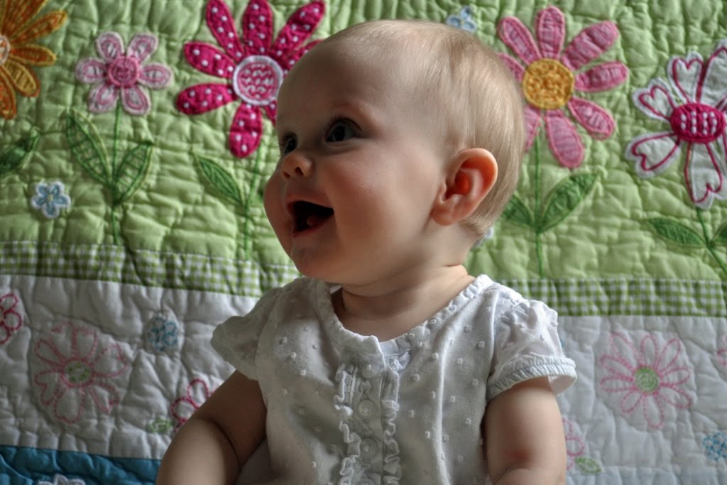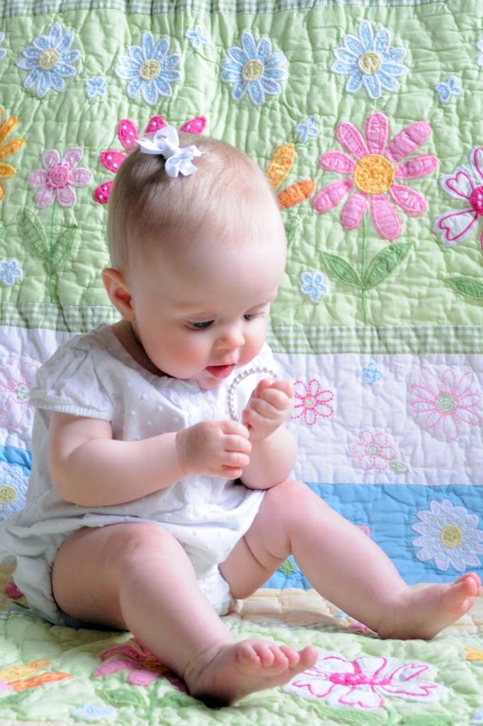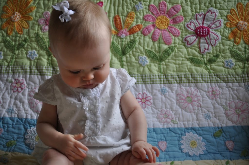 I got some great pictures to mark her seven-month-day. The lighting kept changing in the room with the partly cloudy weather we were having, so the lighting on some is better than others. She is wearing a top that I got her before she was born that I’ve been excited for her to fit into. Behind her is the PBK Daisy Garden quilt that Grandma Keene got her. I thought it was the perfect backdrop to welcome in spring!