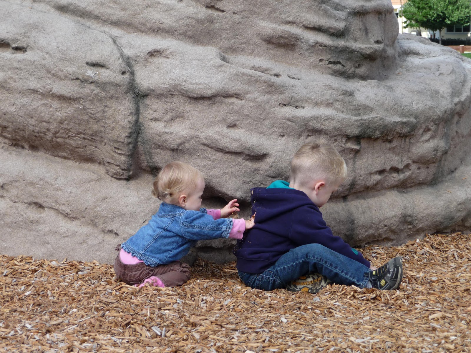 | When JT moved down to play with Haley in the bark chips, she started filling his hood with them. After all, what are little sisters for? |