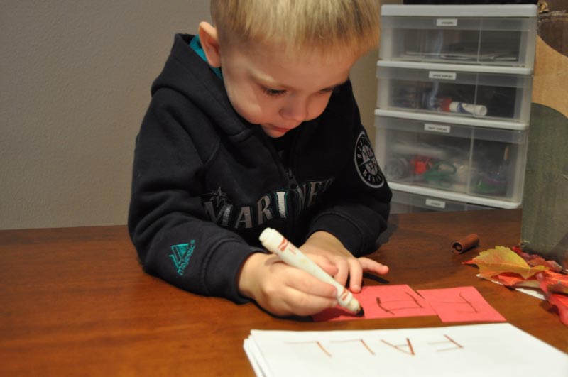 We took a nice walk yesterday afternoon and I decided to do some fall art when we got home. We gathered some leaves, glued them on a strip of paper in layers, and wrote “FALL” on squares to glue on. JT did almost all the gluing himself. “I’ll be the gluer and you be the leafer,” he said. 🙂 Actually, he did most of the leaves himself as well. Then he wrote his letters after we talked about how to spell and and how to make the letters. It’s hanging up now in my kitchen and it looks great.