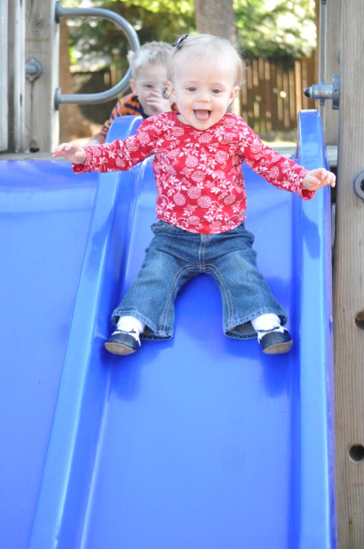 The funny thing about Haley on the slide is that she has NO FEAR. I can barely get her up there before she’s sliding down again. She crawls over, pushes off, and careens down at fast speeds. She went so fast a few times she flung herself right off the end.