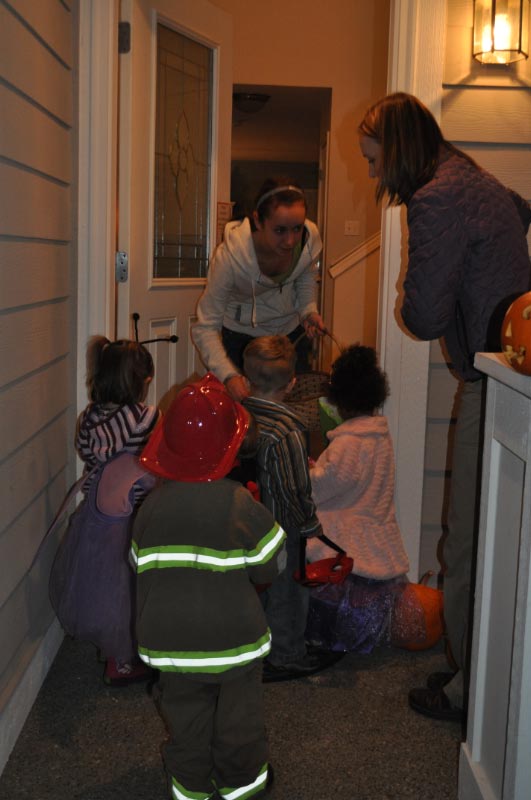 And decorated our treat bags, and went to a whole SIX houses. which was enough for these two- and three-year olds.